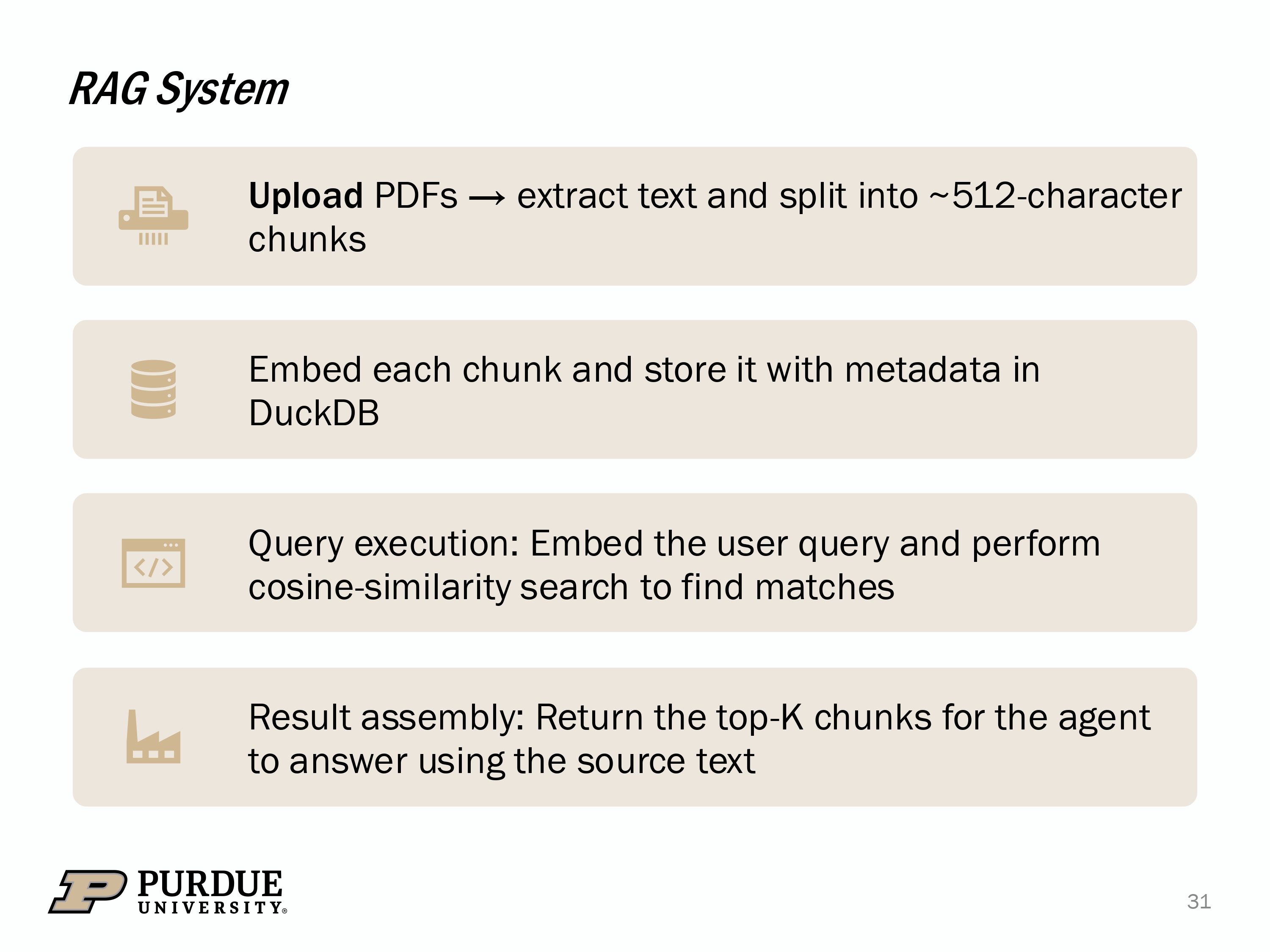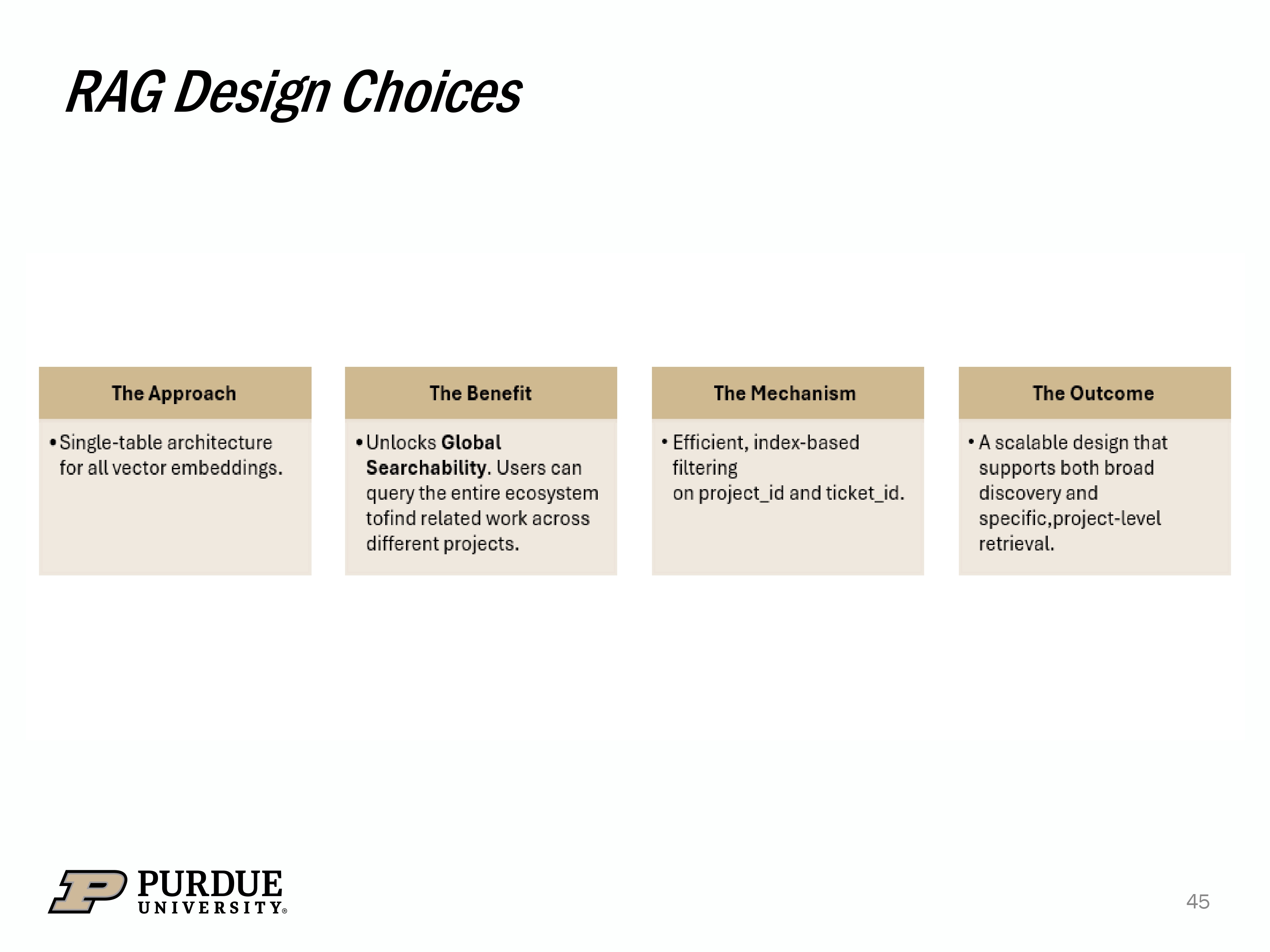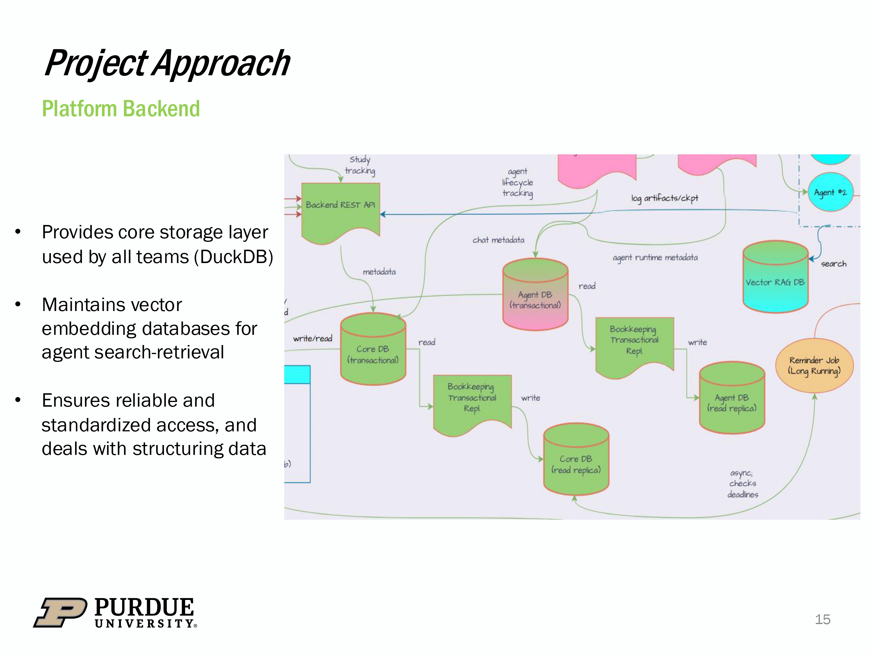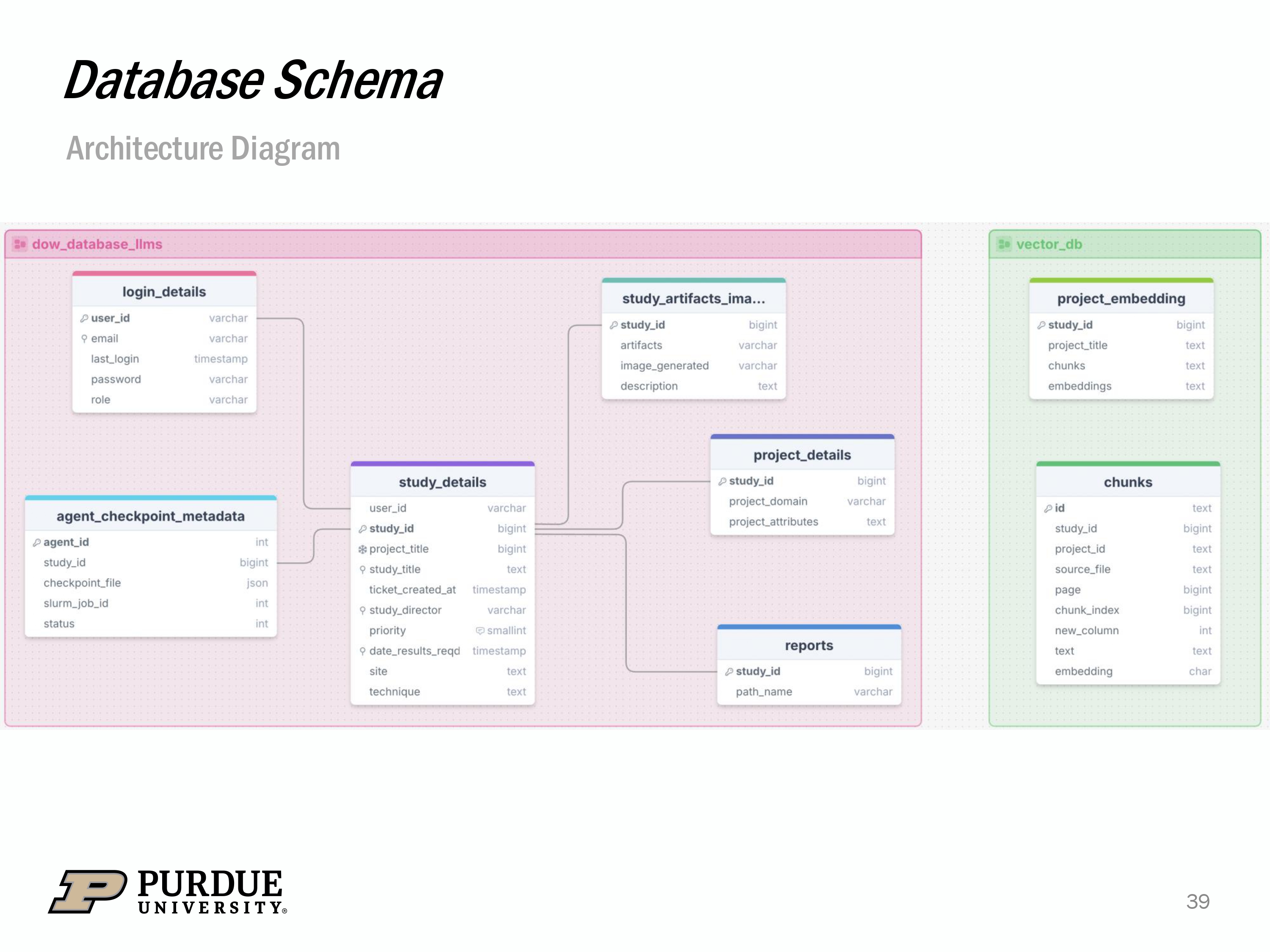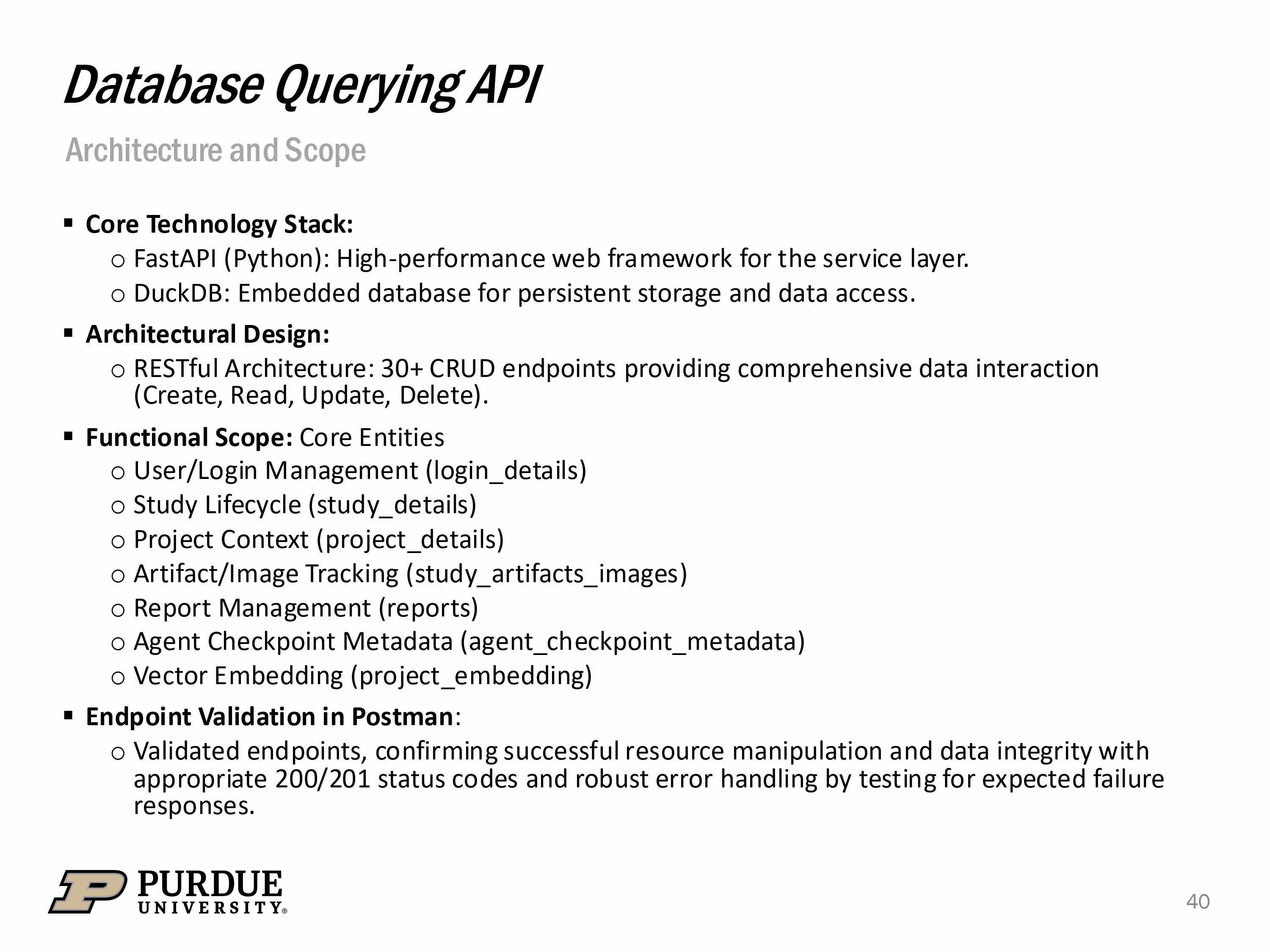 - Architecting full-stack layer integrating FastAPI backend, Dash frontend, LangGraph/DSPy agents & DuckDB vector search on RCAC Anvil.