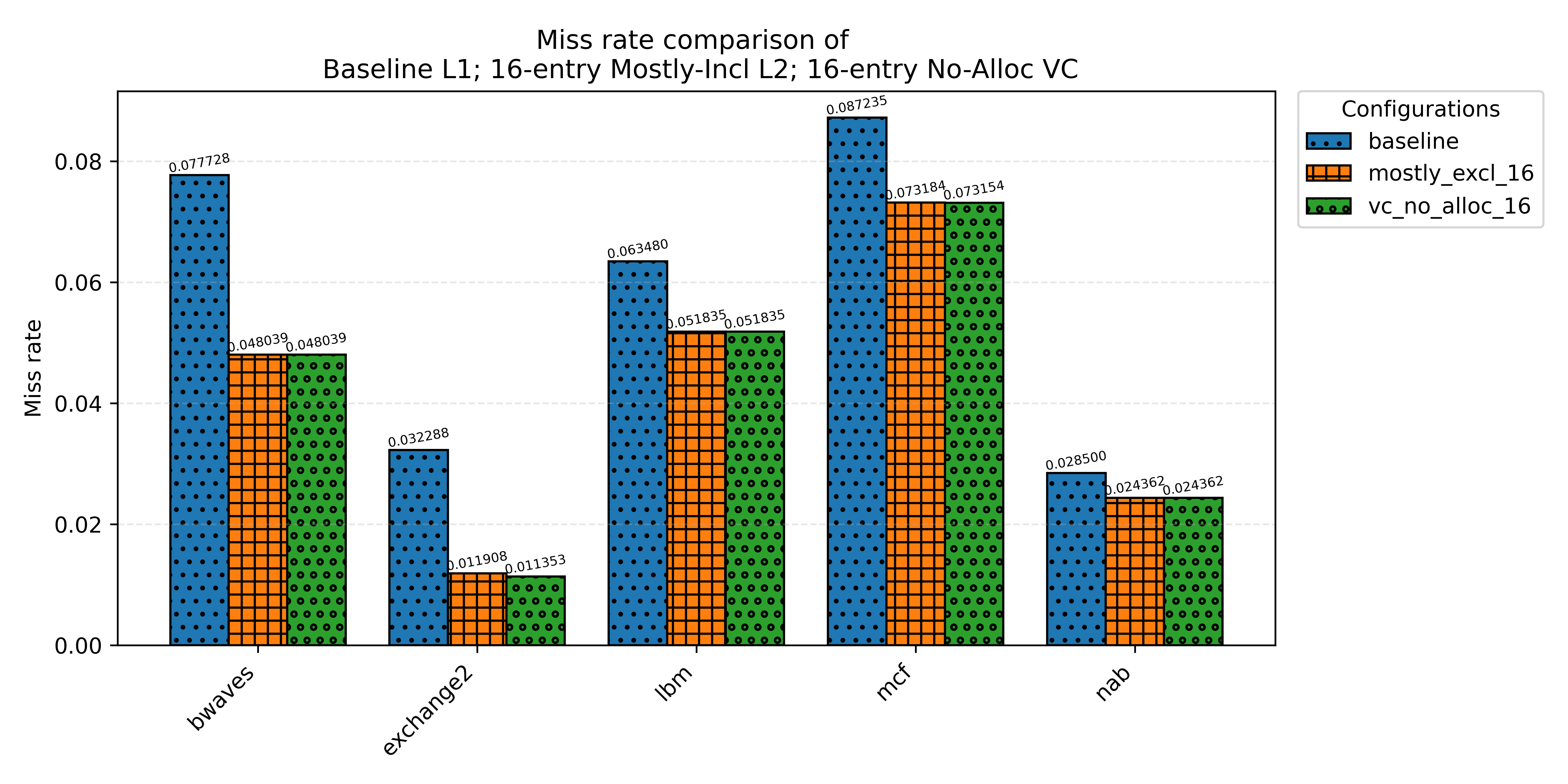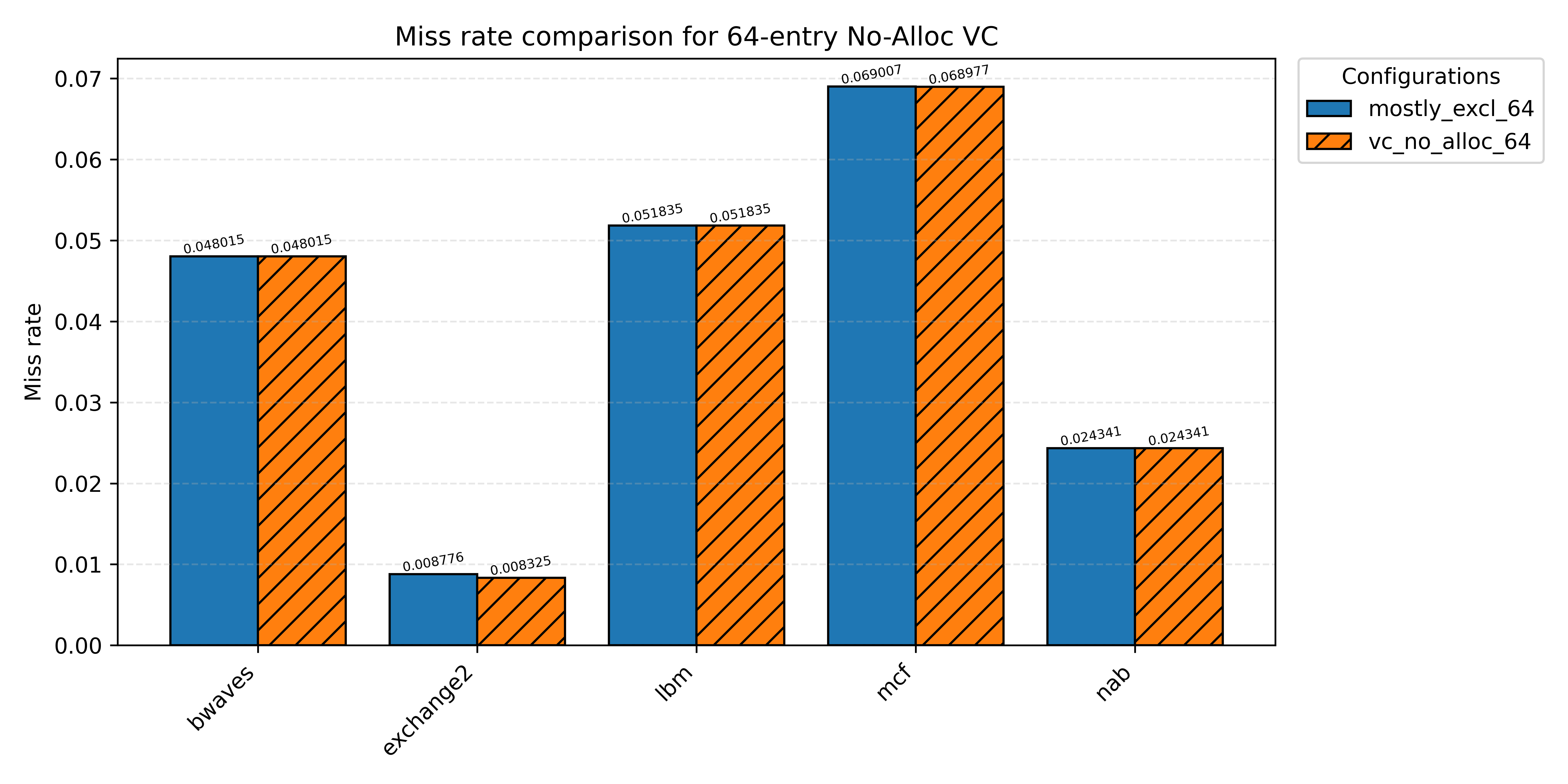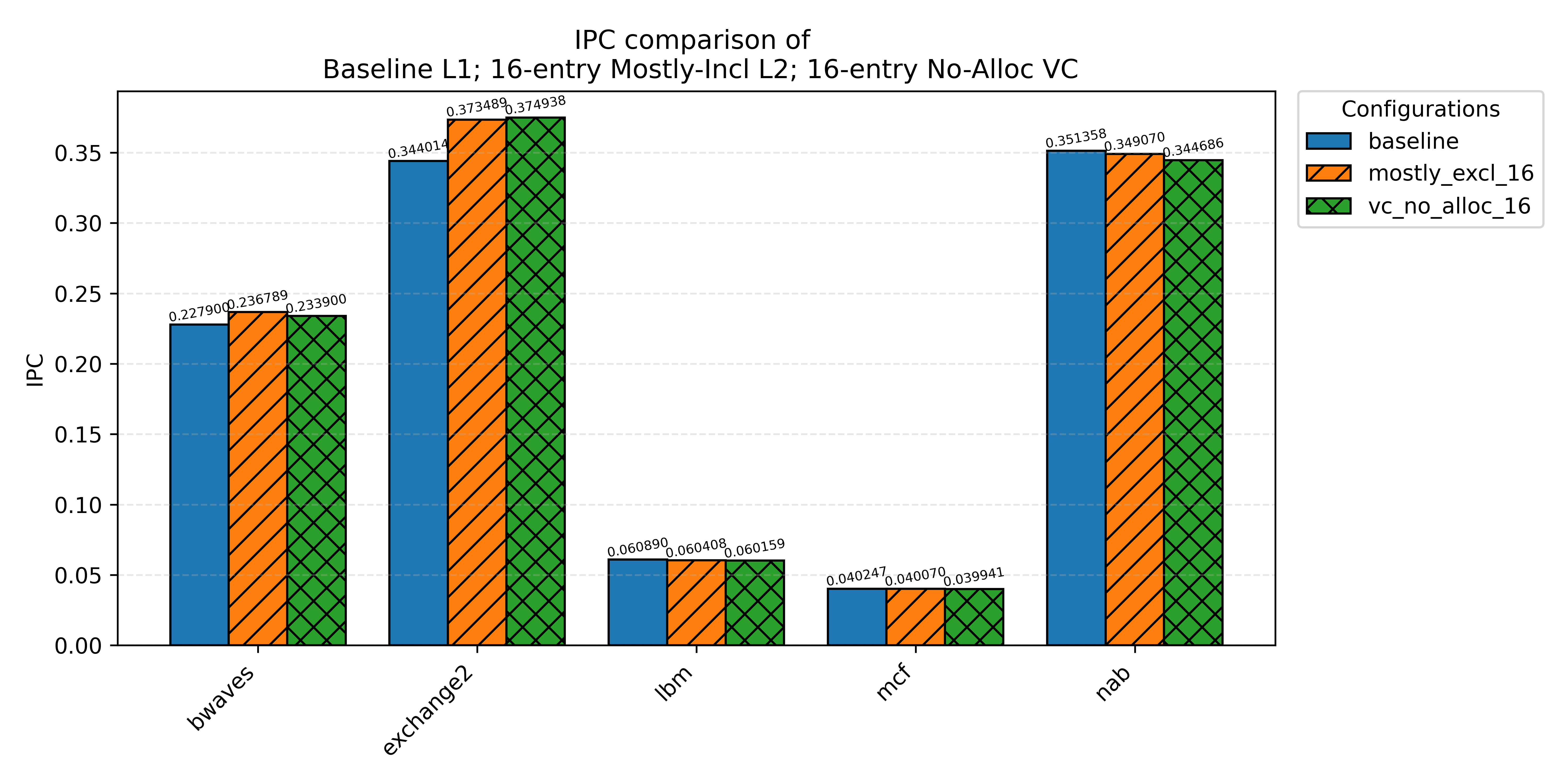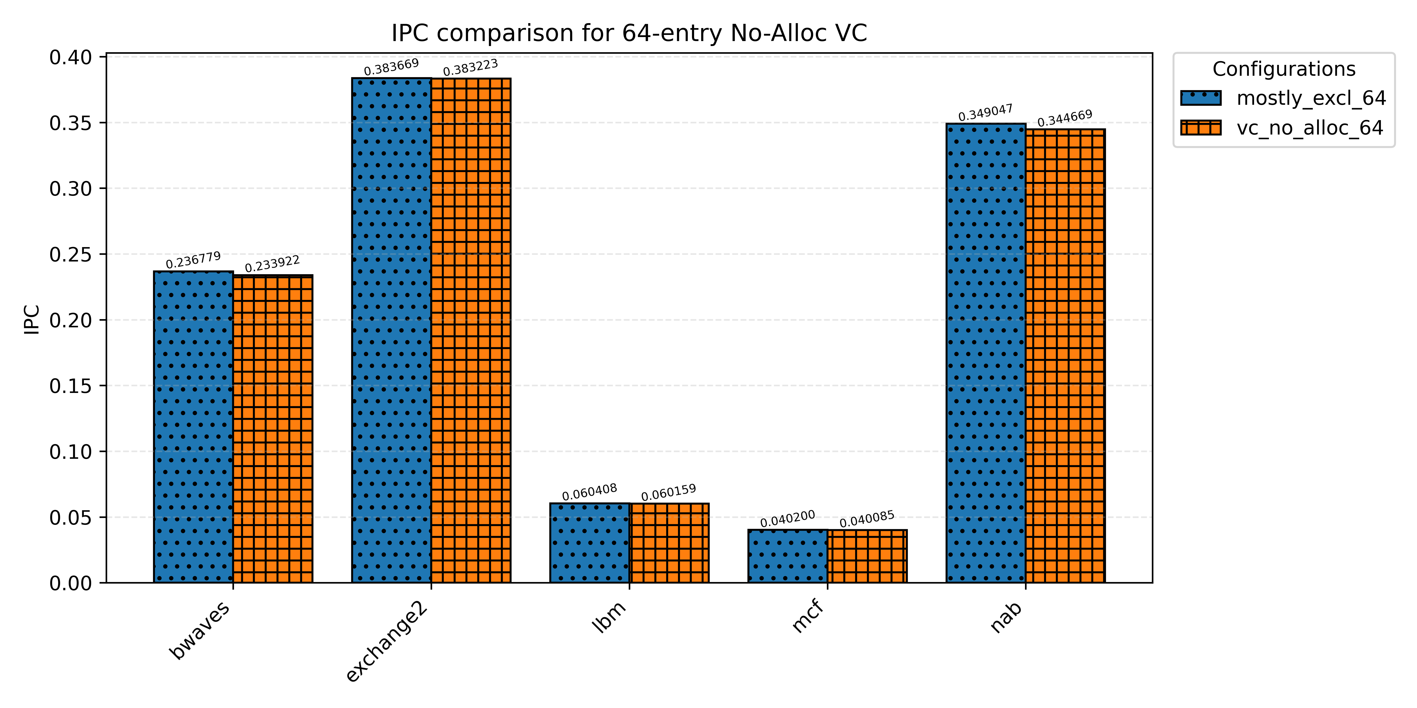 The mostly exclusive victim cache often performs better than the no-allocate victim cache. The miss rate for no-allocate is lower for exchange2 and mcf and the same for the others, but only in exchange2 is there a positive IPC gain for it. The likely explanation is that the no-allocate configuration utilizes the victim cache more since clean victim blocks get written to it in addition to dirty, incurring more cycle latency. Thus, no-allocate can only perform better if the percentage difference in miss rate is large enough to overcome the added cycle delays due to writing back more victim blocks. For example, the percentage difference in miss rate for exchange2 is 5% whereas mcf has a difference 0.04%, demonstrating why only exchange2 has a positive IPC gain.