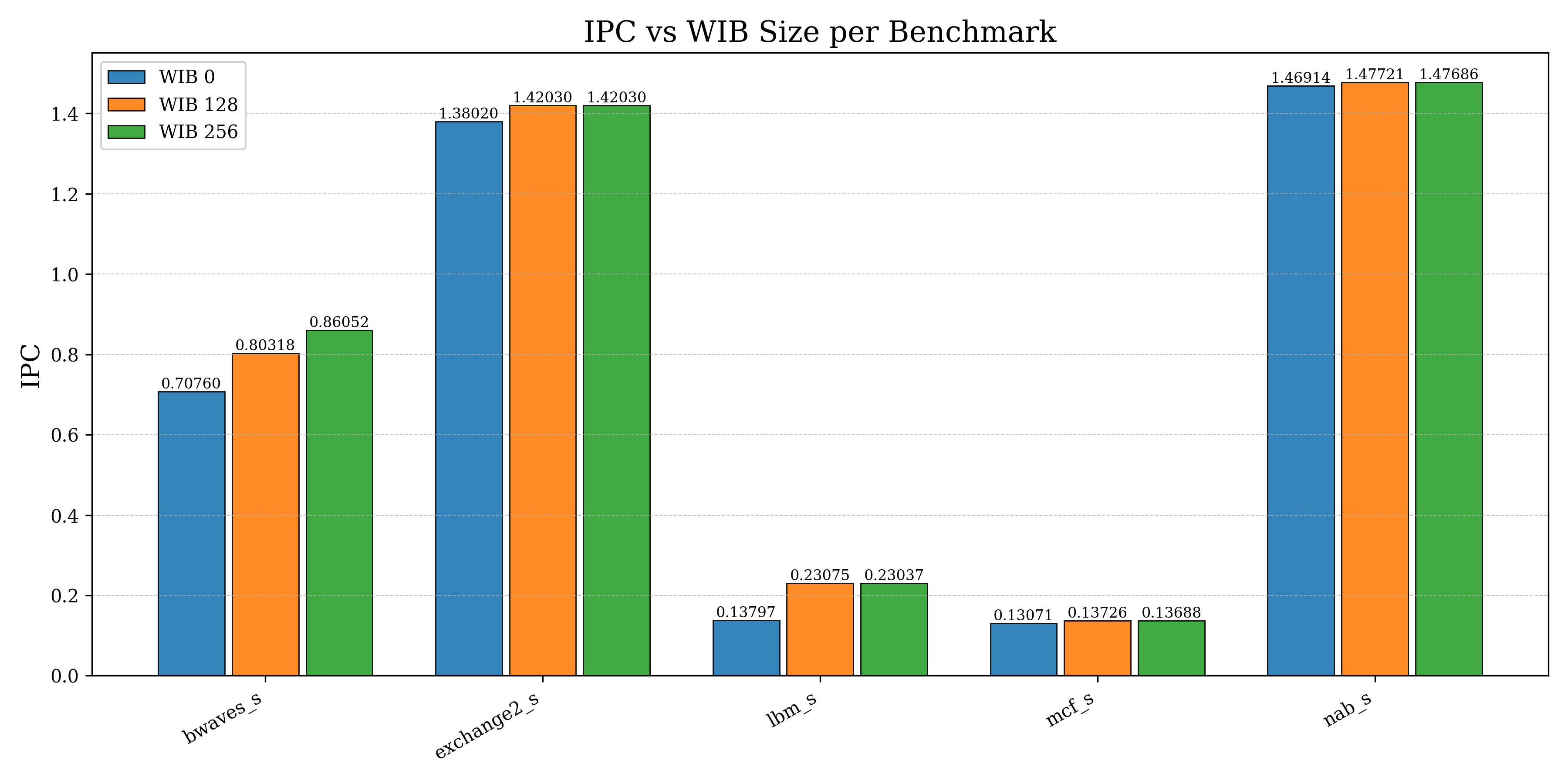 An interesting note from this implementation is that the WIB is often full (for less missRatio-heavy benchmarks), and some instructions stay behind in the IQ because their source registers do not meet the criteria to move to the WIB. As such, when a load miss returns, many dependent instructions are directly considered for issue, instead of having to move out of the WIB first.