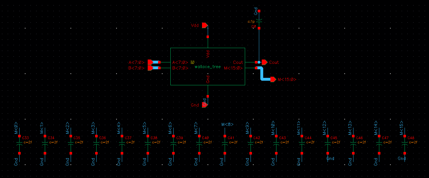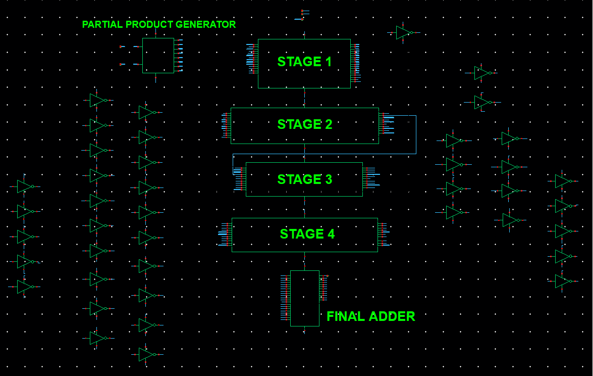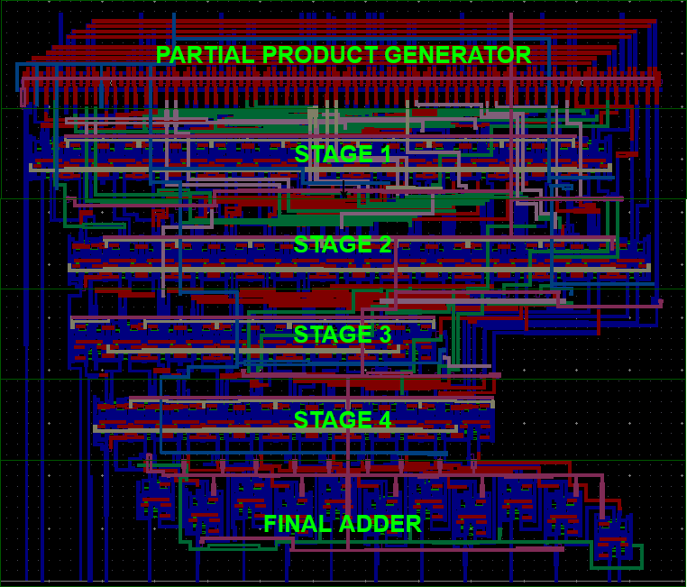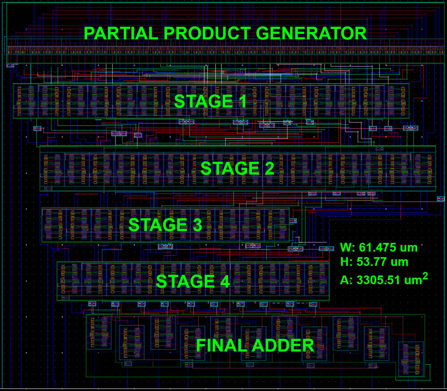 A Wallace Tree Multiplier (WTM) accelerates integer multiplication by reducing partial-products in parallel using carry-save-adder (CSA) chains, followed by a final ripple-carry-adder (RCA) stage. This project successfully implemented an 8-bit WTM using the inversion property to minimize total area. Post-layout validation using the GPDK45nm process library verified that the design met all core requirements with